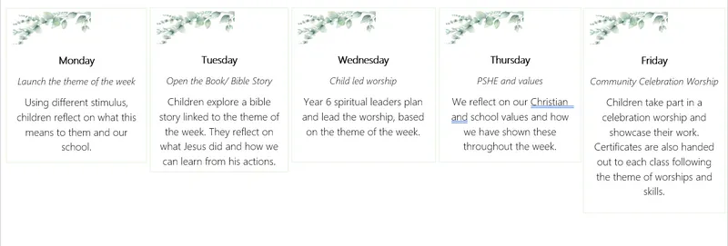 Children, teachers, governors and parents are also given the opportunity to evaluate worship and services, ensuring we are always improving our practice to meet the needs of our children and community.